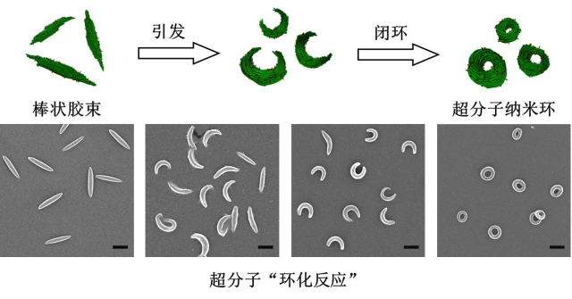 研究发现,聚肽接枝共聚物首先自组装形成棒状胶束,通过调控溶液性质和环境温度,棒状胶束可以发生超分子“环化反应”,头尾闭合形成均一、可控的超分子环状胶束结构,实现超分子纳米环的可控制备。这一发现将环化反应的范畴从小分子和高分子尺度扩展至超分子尺度。此外,研究发现该超分子“环化反应”的过程与生命体中DNA的缩合过程非常相似,研究结果对于聚肽组装体在基因治疗等生命科学领域的应用具有重要意义。该研究工作在林嘉平教授和蔡春华副教授的指导下,由博士生杨朝应和高梁等完成。