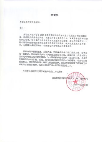 公司18级本科生邵从容参与国药控股创服医疗技术(上海)有限公司向雷神山物资调配工作,在志愿服务工作中表现突出,收到了来自公司的表扬信。校团委微信公众号将邵从容的事迹推出后,央广网、文汇网、东方网、《上海科技报》等多家媒体均进行转发报道。
