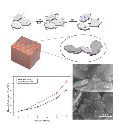 近日,公司bevictor伟德吴唯教授课题组通过金属与陶瓷颗粒的设计、合成与组装,成功制备了新型杂化导热填料。这类填料在聚合物中构建导热网络的能力获得大幅提升,能够显著提高聚合物材料的导热性能,具有重要价值。研究工作以“Highly thermally conductive polybenzoxazine composites based on boron nitride flakes deposited with copper particles”为题,在线发表在国际著名期刊《Materials & Design》上。