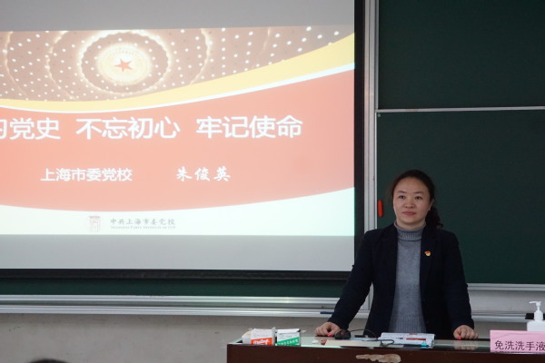 动员会后,上海市委党校朱俊英博士作了题为“学习党史 不忘初心、牢记使命”的主题报告。朱俊英系统阐述了“党史是什么”、“为什么学”、“怎么学”。从渔阳里与中共党史上的“第一”、“真理的味道有点甜”、“遵义会议与鸡鸣三省村会议”、“星星之火 可以燎原”、“上海改革三句话”等党史小故事让与会师生形象地“看到”了党的发展历程,中国共产党为什么“能”,马克思主义为什么“行”、中国特色社会主义为什么“好”。她强调学习党史要理清历史脉络,把握历史规律,坚持科学历史观,坚定理想信念,铸牢初心使命,准确把握主线。