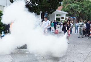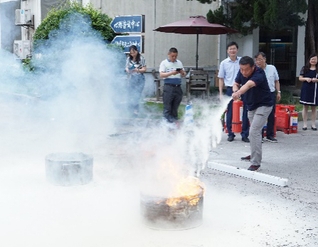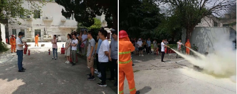 随后,公司在实验一楼东门外的空地上开展了灭火演练。段凯洋老师向大家讲解了灭火器的基本知识和使用要点。校保人员点燃起两个着火桶,每位教师都拿起灭火器进行了操作练习。在练习过程中,校保人员不时提醒操作规范,并纠正错误动作。