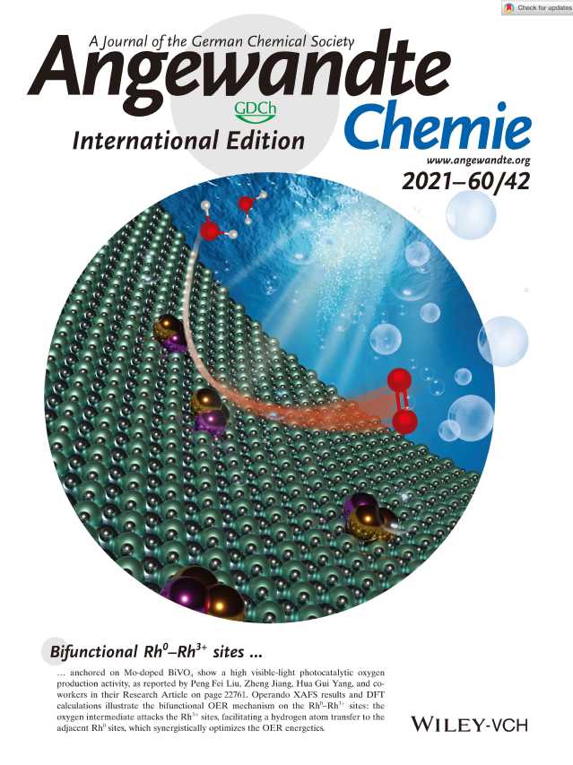 近日,国际知名学术期刊《Angew. Chem. Int. Ed.》以“Boosting Photocatalytic Water Oxidation Over Bifunctional Rh0-Rh3+ Sites”为题,在线报道了公司bevictor伟德清洁能源材料与器件团队在人工光合成领域的最新研究成果,并以内封面文章的方式重点报道。