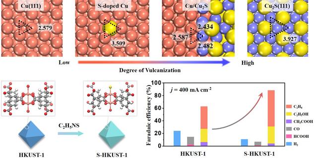 针对这一关键问题,研究团队创新性地采用局域硫掺杂策略在廉价Cu基催化材料中引入离散的Cu-S组分。研究发现,该催化剂可以原位重构得到具有丰富活性结构的两相铜/硫化铜界面,电流密度达到400 mA cm-2,乙烯法拉第效率高达57.2%,多碳产物(乙烯、乙醇和乙酸)法拉第效率为88.4%。通过Operando X射线同步吸收谱等表征证明,离散的Cu-S组分可以在CO2还原工况环境下稳定高活性的Cuδ+组分;密度泛函理论计算进一步揭示两相铜/硫化铜界面处的Cuδ+组分C-C偶联位点空间距离适中,可以协同降低C-C偶联步骤的能垒。该工作实现了电催化二氧化碳还原制乙烯性能的大幅提升,对二氧化碳资源化利用实现闭环碳循环,以及助力“碳达峰、碳中和”目标的实现具有重要意义。