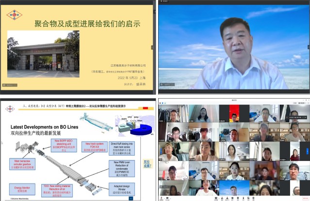 盛承林员工从生活中的瓶装饮料包装瓶体、瓶盖、标签,抗原检测系列材料、口罩熔喷布制取等为切入点,引入了聚合物及其成型的概念和和对聚合物产业领域研究方向的探寻与思考。他循序渐进地介绍了聚合物和新材料的分类、来源、发展历程、三次工业革命和正在行径中的第四次工业革命以及这些过程中的重要贡献者,结合翔实的数据和丰富的视频介绍了薄膜、纺织和非织造、挤出拉伸薄膜和管材、气泡膜、注塑等成型工艺发展现状,同时,盛承林员工还从家国情怀、社会层面、马斯洛多维需求层次等阐释了成型工艺创新的动力、中国制造在全球市场中的特点等等。通过讲述中国近代化学的启蒙者徐寿等知名学者的故事,强调了求真务实对于科创研究的重要性。每一种聚合物合成和制品制取(成型)都是规律求索和创造性发挥的结果,坚持“科学-技术-商业”一体化的发展模式才能为中国创造、中国制造带来无限的动力。盛承林员工通过解读华理校徽的含义,鼓励参会员工在夯实专业理论基础的同时,开拓视野,大胆想象,敢于创新,勤于实践。报告中,盛承林员工祝福母校70华诞生日快乐,蒸蒸日上!