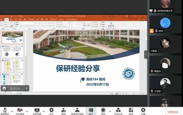 陈珂首先向参会员工介绍了保研政策和总体的情况。随后分享了他保研至复旦大学高分子系的心得。他建议,同学之间可以多分享多交流,也建议向往届保研到自己心仪院校的学长学姐提前了解夏令营情况和面试题型,面试时才能胸有成竹。董涵泳分享了他保研到上海硅酸盐研究所的经验。他建议同学们可以适当紧张,但不要过分担忧,他介绍了上海硅酸盐研究所与高校在科研环境等方面的不同。郭艳宇在2022年考研中以410分综合排名第一的佳绩考研本校材料科学与工程专业。她从考试流程、复试准备、备考详解、心态调整四个方面详细向同学们分享了她的考研历程,用自己的故事鼓励了本科数学学习薄弱的同学建立信心,沉着备考。郑昌昊即将就读于中国科公司上海微系统与信息技术研究所信息功能材料重点实验室,他分享了他选择跨专业读研的心路历程,给依旧迷茫于专业方向选择的同学提供了思路。