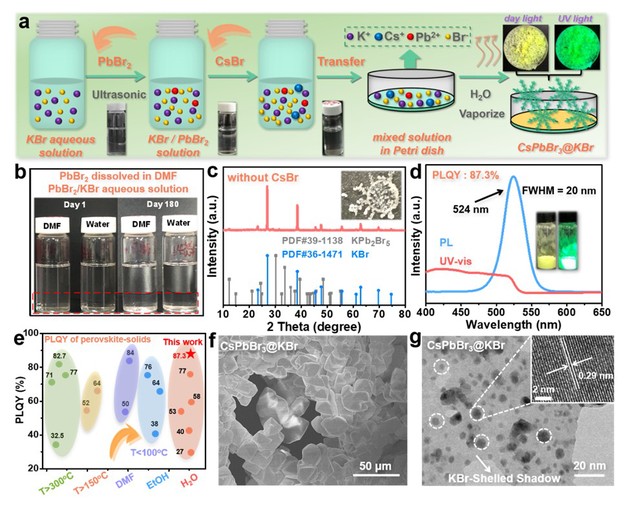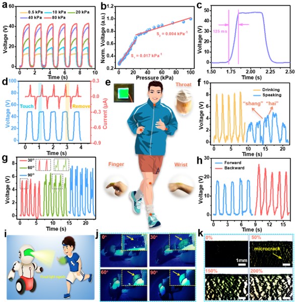 可穿戴电子设备近几年发展迅速,其目标是轻量化、小型化和高度集成。作为可穿戴电子设备之一的可穿戴表皮传感器的趋势是迅速将输出的生理信号转换为易于读取或可视化的信号,或在单个平台上集成光栅传感和显示功能,从而满足可穿戴交互设备中不断增长的“屏幕中的传感器”需求,作为其能量来源之一的摩擦纳米发电机(TENG)因高瞬时功率输出、多功能性、低成本和易于制造而受到极大关注。在TENG中,盐类通常作为添加剂来提高输出性能,而钙钛矿纳米晶由于高发光效率近几年成为研究热点。基于此,伟德bv国际体育袁双龙课题组创新性提出一种非常简便的水蒸发结晶策略来制备CsPbBr3@KBr固体添加剂,其具有狭窄的半高峰宽、高量子产率以及优异的光照射和热稳定性。在高效发光实现实时显示的同时提高了TENG输出效率,将其与PVA结合作为TENG正极摩擦材料时,其输出性能提高了2.3倍,基于此构建了响应时间为125 ms和响应范围为0-100 kPa的可穿戴传感器用作人体实时运动监测,扩展了钙钛矿基材料的应用领域,并显示了其在自供电的可穿戴传感器领域的巨大前景。