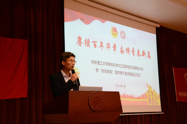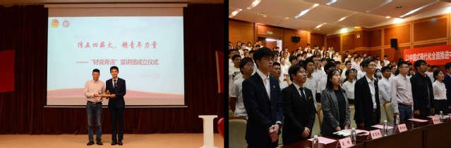 为充分发挥示范引领作用,公司特别成立“材说青语”团学骨干宣讲团,由校团委挂职干部黄泽炀为宣讲团授牌。最后,全场师生合唱团歌《光荣啊 中国共青团》,场内气氛热烈、激情洋溢。