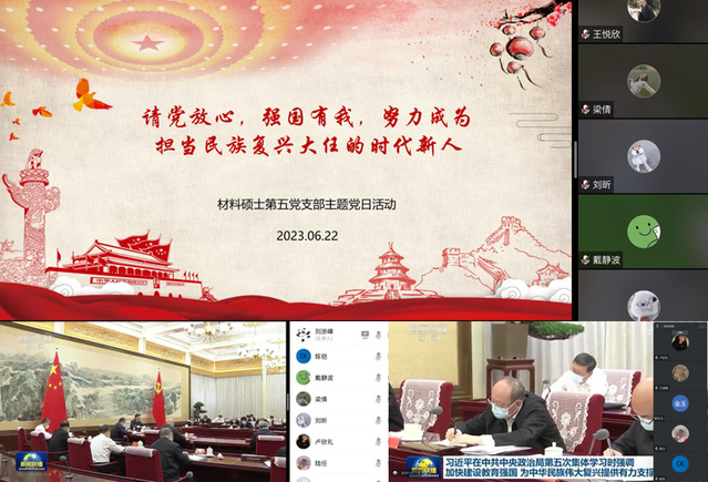 为深入学习贯彻习近平总书记在中央政治局第五次集体学习时的重要讲话精神,6月22日,材料硕士第五党支部开展了“坚定不移听党话、跟党走,努力成长为堪当民族复兴重任的时代新人”主题党日活动,活动由党支部书记刘浙峰主持。