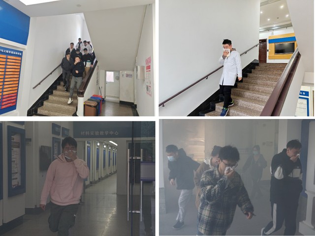 消防应急疏散演练正式开始,工作人员在实验一楼两侧门口点燃烟饼,模拟火灾发生场景,随着火警警报响起和语音提示,全体工作人员迅速反应,实验一楼师生在各楼层引导员的指挥下,捂住口鼻,快速有序撤离到安全区域,顺利完成疏散演练。