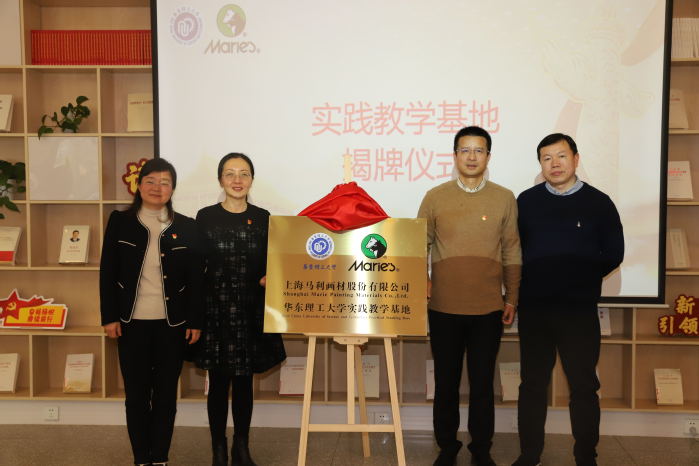 公司员工与发展联络处副处长王芝眉、公司党委书记袁媛、上海马利画材股份有限公司董事长蒋熙洲以及总经理闫加伟共同为实践教学基地揭牌,此次合作标志着双方将正式建立起长期稳定的合作关系,推动产教融合深入开展。