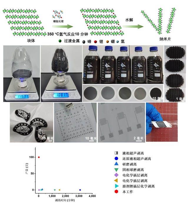 研究团队在国际上首次实现碲化铌纳米片的宏量(108g)制备,为二维过渡金属碲化物纳米片的规模化制备提供了可能性。《自然》杂志审稿人评价该方法“简单、快速、高效,对二维材料的宏量制备具有普适意义。”