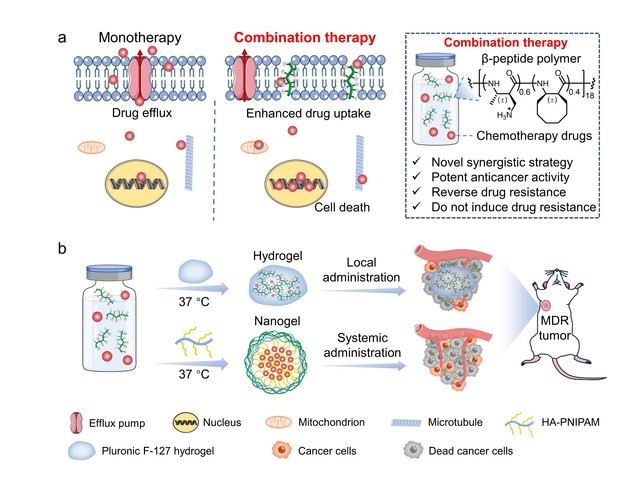 肿瘤对化疗药物产生的多药耐药性和交叉耐药性仍然是癌症治愈的主要障碍。目前,单一疗法只能暂时缓解肿瘤的进展,无法避免抗癌药物耐药性的出现。为了解决肿瘤耐药性难题,一种有效策略是将现有的两种或多种化疗药物联合使用,以减少药物用量并获得更好的治疗效果。然而,由于单个化疗药物固有的耐药性以及肿瘤细胞对多种药物组合的交叉耐药性,现有的药物组合也出现了耐药性问题。因此,迫切需要寻求新型治疗药物和现有化疗药物的协同组合能逆转化疗药物的耐药性并减轻耐药性的产生。刘润辉教授课题组在前期研究中通过设计宿主防御肽的合成模拟物,开发出了一类抗多药耐药肿瘤的β-多肽聚合物(J. Am. Chem. Soc. 2022, 144(16): 7283-7294)。这些β-多肽聚合物对多药耐药癌细胞具有高效且广谱的抗癌活性,并且通过膜裂解机制杀死癌细胞,因此重复使用不会导致癌细胞产生耐药性。这启发作者提出设想:β-多肽聚合物可以通过增加细胞膜的通透性来促进化疗药物的跨膜转运,从而增加药物摄取和细胞内药物积累。因此,作者进一步探索抗肿瘤β-多肽聚合物和多种化疗药物的协同作用。研究发现抗肿瘤β-多肽聚合物和多种化疗药物具有广谱且高效的协同作用,逆转多药耐药癌细胞对多种化疗药物的耐药性。β-多肽聚合物和阿霉素的协同组合在小鼠多药耐药黑色素瘤和耐药原位乳腺癌模型中都显著改善了阿霉素的治疗效果。值得注意的是,癌细胞不会对β-多肽聚合物和阿霉素的协同组合产生耐药性。因此,β-多肽聚合物和化疗药物的协同策略为耐药肿瘤治疗和逆转肿瘤耐药性提供了新思路。