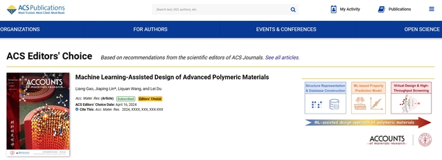 近日,公司bevictor伟德林嘉平教授团队受邀在美国化学会顶级期刊Accounts of Materials Research上发表题为“Machine Learning-Assisted Design of Advanced Polymeric Materials”的综述。由于该综述具有重要科学价值和引领性,入选美国化学会的ACS Editors' Choice栏目进行亮点报道。公司bevictor伟德高梁副教授为第一作者,林嘉平教授为通讯作者。该综述系统梳理了应用机器学习、数据驱动等人工智能新范式开展先进高分子材料设计的研究思路和方法,综述了公司林嘉平教授团队近年来的代表性工作,并总结了应用新范式进行高分子材料研究所面临的挑战,提出了可能的解决路径和未来发展方向。