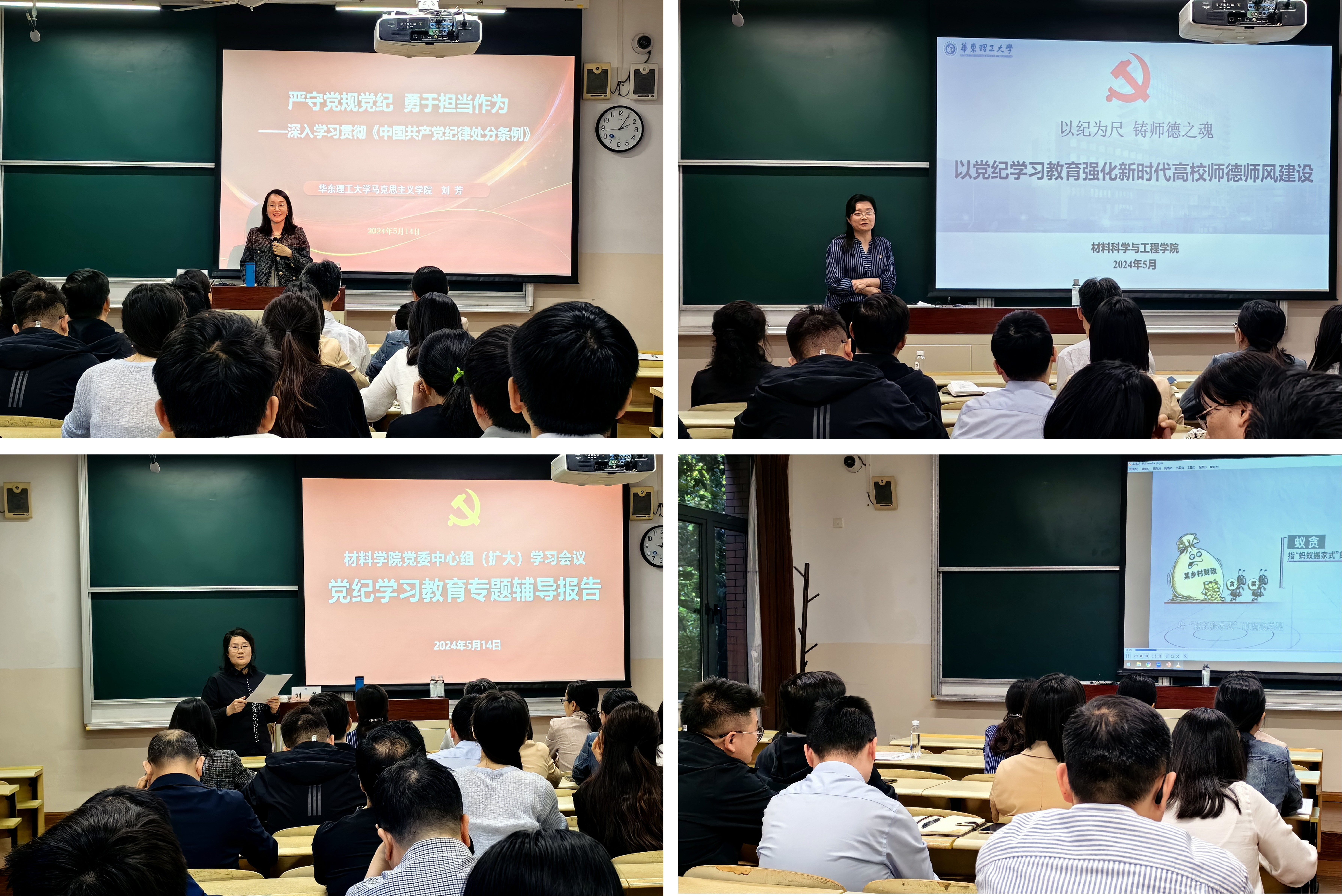 为落实公司党委关于党纪学习教育的相关要求,推进党纪学习教育走深走实,5月14日,材料科学与工程公司党委中心组(扩大)学习会议在七教101召开。围绕新修订的《中国共产党纪律处分条例》(以下简称《条例》)的学习,会议邀请马克思主义公司副教授、党委委员、工会主席刘芳作专题辅导报告,公司党委书记袁媛上纪律党课,教工党员集体观看了警示教育片。公司党政领导班子成员、党委委员、纪委委员、师生党支部书记、纪检委员、教师党员代表、新进教职工、专职组织员等50余人参加学习。会议由公司党委副书记兼纪委书记苏建玲主持。