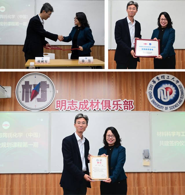 签约仪式上,戴诚安、徐慧代表双方签署社会实践教育基地共建协议,双方表示将在员工发展方面探索新的合作模式,通过开设职业发展指导系列课程,帮助材院学子做好职业规划。戴诚安代表公司为企业方代表进行授牌,并颁发企业导师聘书。