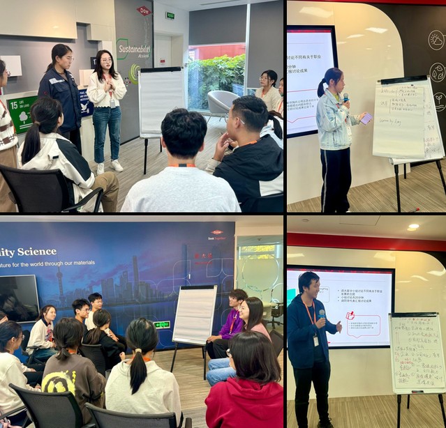 活动的最后,陶氏公司各部门专家以志愿者的身份,加入同学们的四个小组,一起围绕“公司与职场的区别”、“职业思维与员工思维”、“工作需要的能力和技能”以及“我们如何为求职做准备”四个话题,展开了激烈的讨论。同学们在踊跃表达自己对于未来职业生涯的想法与疑问的同时,也聆听陶氏公司志愿者们的分享,现场气氛轻松活跃。各个小组派出各自的代表做出了相应的总结分享。