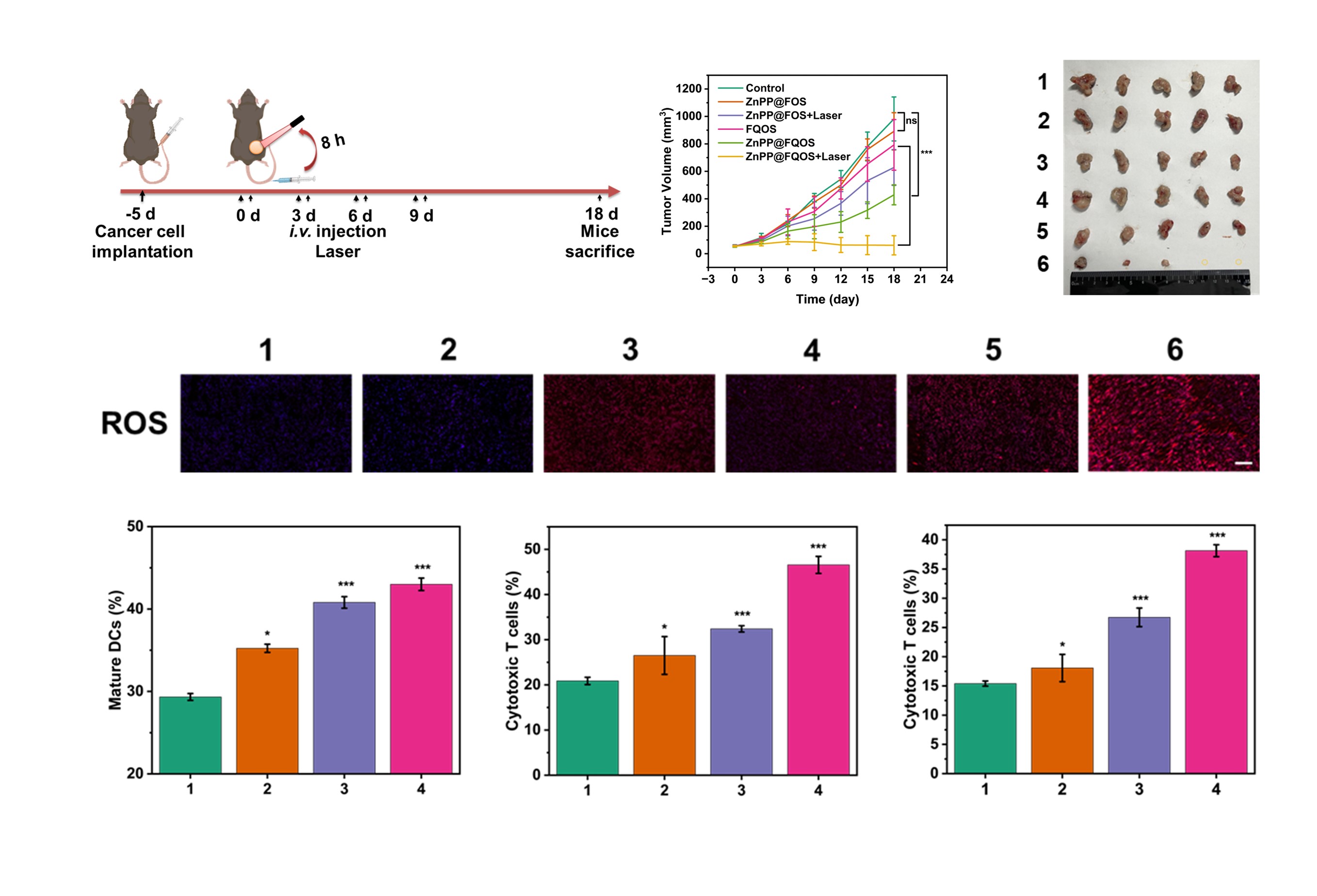 图3. 单侧及双侧皮下肿瘤模型模拟ZnPP@FQOS的抑瘤能力、ROS调控效果以及全身性免疫激活能力。单侧瘤模型分组:(1:Control; 2:ZnPP@FOS; 3:ZnPP@FOS+Laser; 4:FQOS; 5:ZnPP@FQOS; 6:ZnPP@FQOS+Laser);双侧瘤模型分组:(1: Control; 2: Anti-PD-L1; 3: ZnPP@FQOS+Laser; 4: ZnPP@FQOS+Laser+anti-PD-L1)