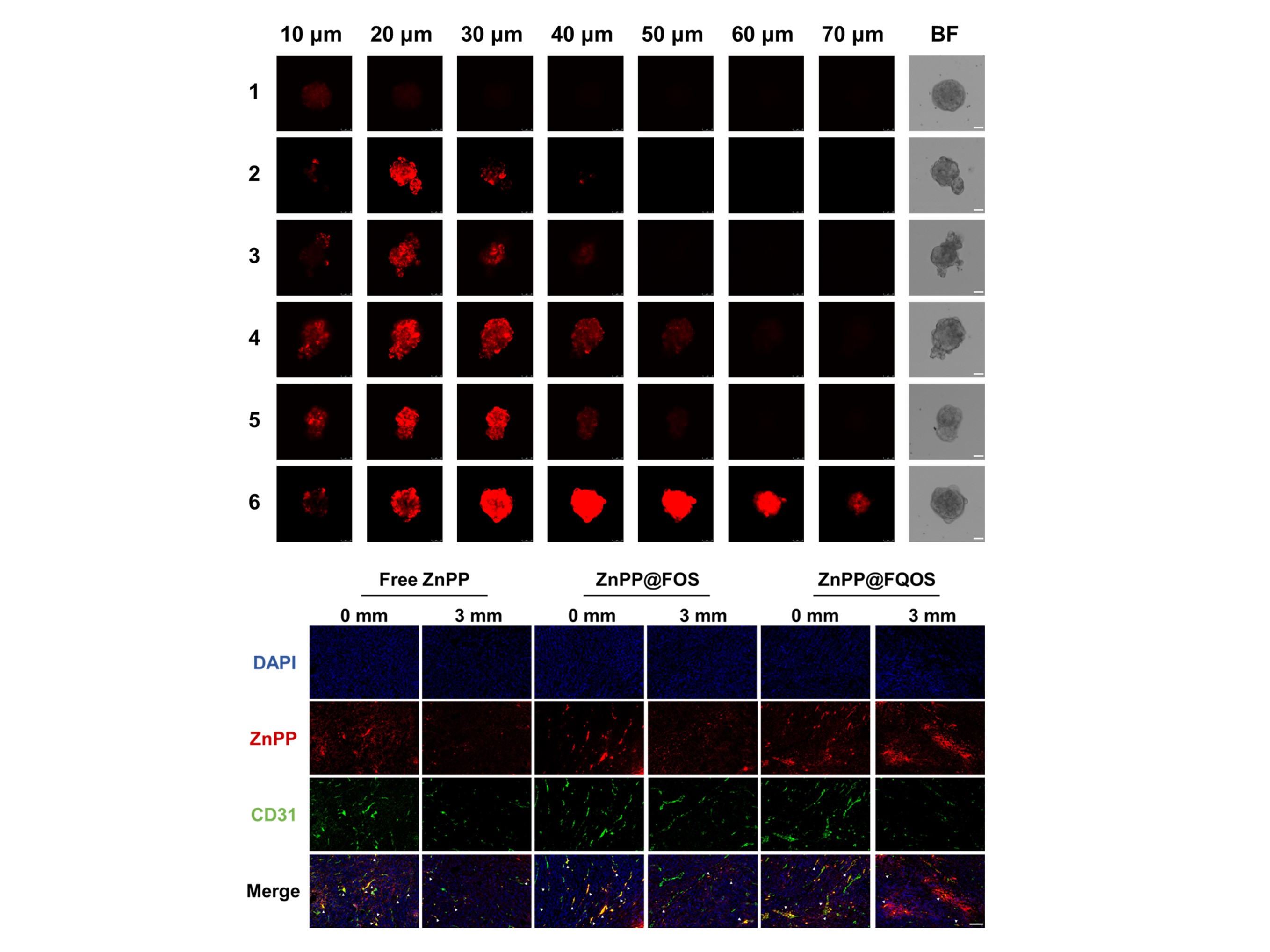 图2. 利用多细胞肿瘤球以及肿瘤组织评估ZnPP@FQOS的组织渗透能力。(1:Free ZnPP; 2:ZnPP@FOS; 3:ZnPP@FOS pH=6.5; 4:ZnPP@FOS+Free Que; 5:ZnPP@FQOS; 6:ZnPP@FQOS pH=6.5)