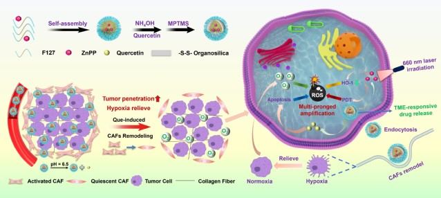 基于活性氧(ROS)的肿瘤疗法,如光动力疗法、声动力疗法、化学动力学疗法等已被广泛研究。然而,细胞内抗氧化应激防御机制由于可减轻肿瘤部位ROS的细胞毒性、帮助肿瘤细胞逃避氧化应激损伤,使ROS基疗法治疗水平大打折扣。近期提出的原位多途径调控ROS策略有望在提高疗效中发挥作用,但肿瘤细胞内、外源ROS调控途径之间往往会相互干扰,且肿瘤微环境(TME)内存在的严重缺氧状态又制约了其疗效的发挥。因此,亟需发展针对肿瘤微环境中不同组分间相互作用的ROS调控策略,以放大肿瘤治疗疗效。成纤维细胞在TME中广泛分布并且伴随癌症的进展会被诱导成激活状态形成癌症相关成纤维细胞 (CAFs),活化的CAFs将使肿瘤内部产生高间充质压力,进而压迫肿瘤血管、减少纳米药物渗透并阻碍外部氧气供应导致治疗效果不理想。基于此,研究团队利用TME中的CAFs这一靶点,设计并构建了一种新型TME响应杂化纳米药物(ZnPP@FQOS),其通过“限域”装载原卟啉锌(ZnPP)和槲皮素(Que),可实现CAFs的重塑以及内、外源多途径ROS的调控,进而增强肿瘤治疗效果(图1)。当ZnPP@FQOS经血管渗入TME时,它首先会响应TME的弱酸性pH值从硅基杂化壳层中释放Que,作用于CAFs并将其重塑,为ROS生成提供氧气原料以缓解缺氧且有助于纳米药物渗透。同时,被肿瘤细胞内吞的Que可通过下调凋亡拮抗蛋白Bcl-xL实现细胞凋亡。此外,进入肿瘤细胞后二硫键交联的杂化硅基壳层会响应过量的谷胱甘肽释放ZnPP,从而在激光照射时引发光动力效应产生单线态氧,并通过下调血红素加氧酶1(HO-1)破坏抗氧化应激防御系统,最终实现了内、外源“多管齐下”的ROS调控策略。