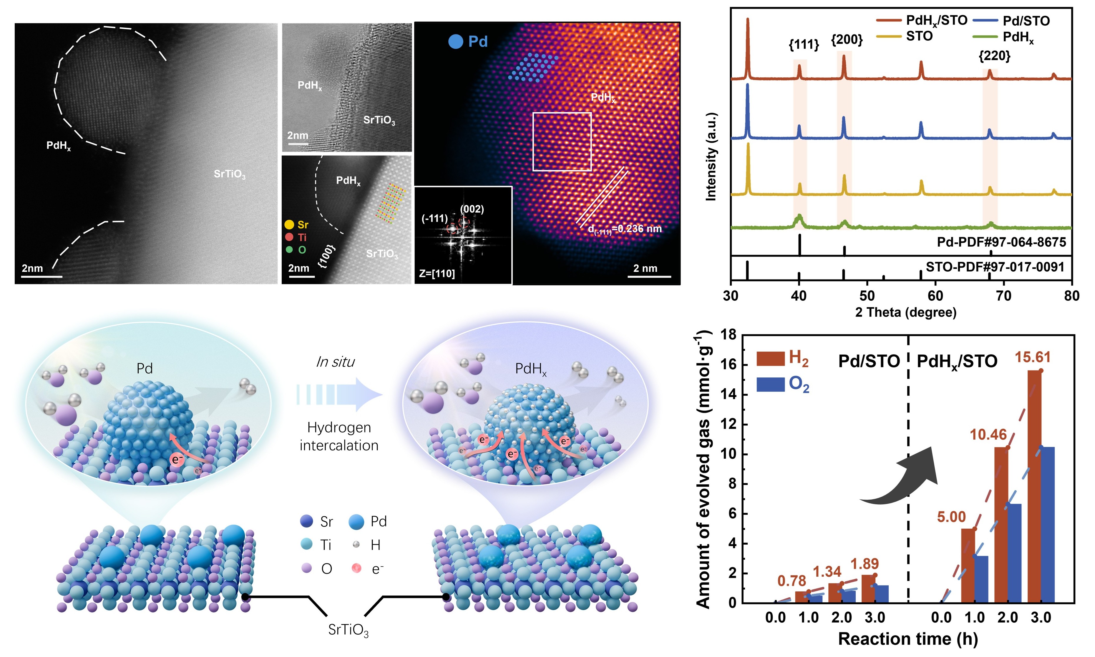 针对这一关键问题,公司bevictor伟德清洁能源材料与器件团队选取钛酸锶(SrTiO3, STO)作为半导体光催化材料,通过在STO表面定向锚定晶格匹配的Pd纳米团簇作为助催化剂,进一步通过原位注氢手段可控构建出PdHx活性结构。PdHx/STO的光催化体系展现出优异的光分解纯水制氢性能,其氢气析出速率高达5 mmol·g-1·h-1,较未注氢前的Pd/STO提升6.4倍。